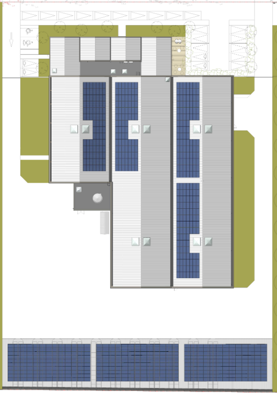Toiture bâtiment Stockage : 427 Panneaux pour une puissance de 160,125 kWc installé sur 778m²
